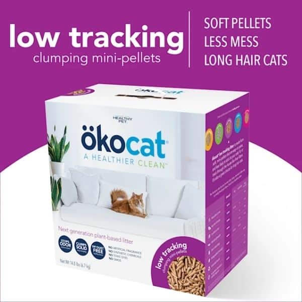 Getting the right cat litter is paramount. My personal favorite has got to be, hands down, the Okocat Mini Pellets Unscented Clumping Wood Cat Litter.